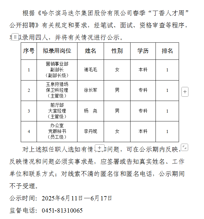 关于马迭尔集团股份有限公司拟任职人选的公示